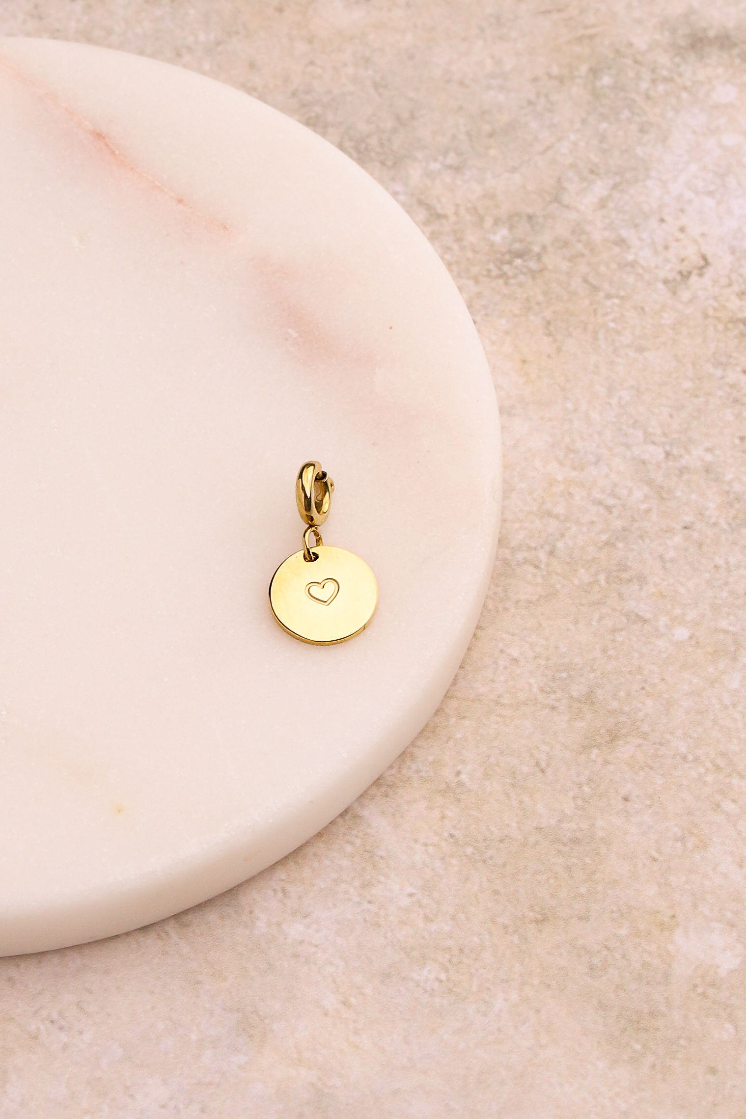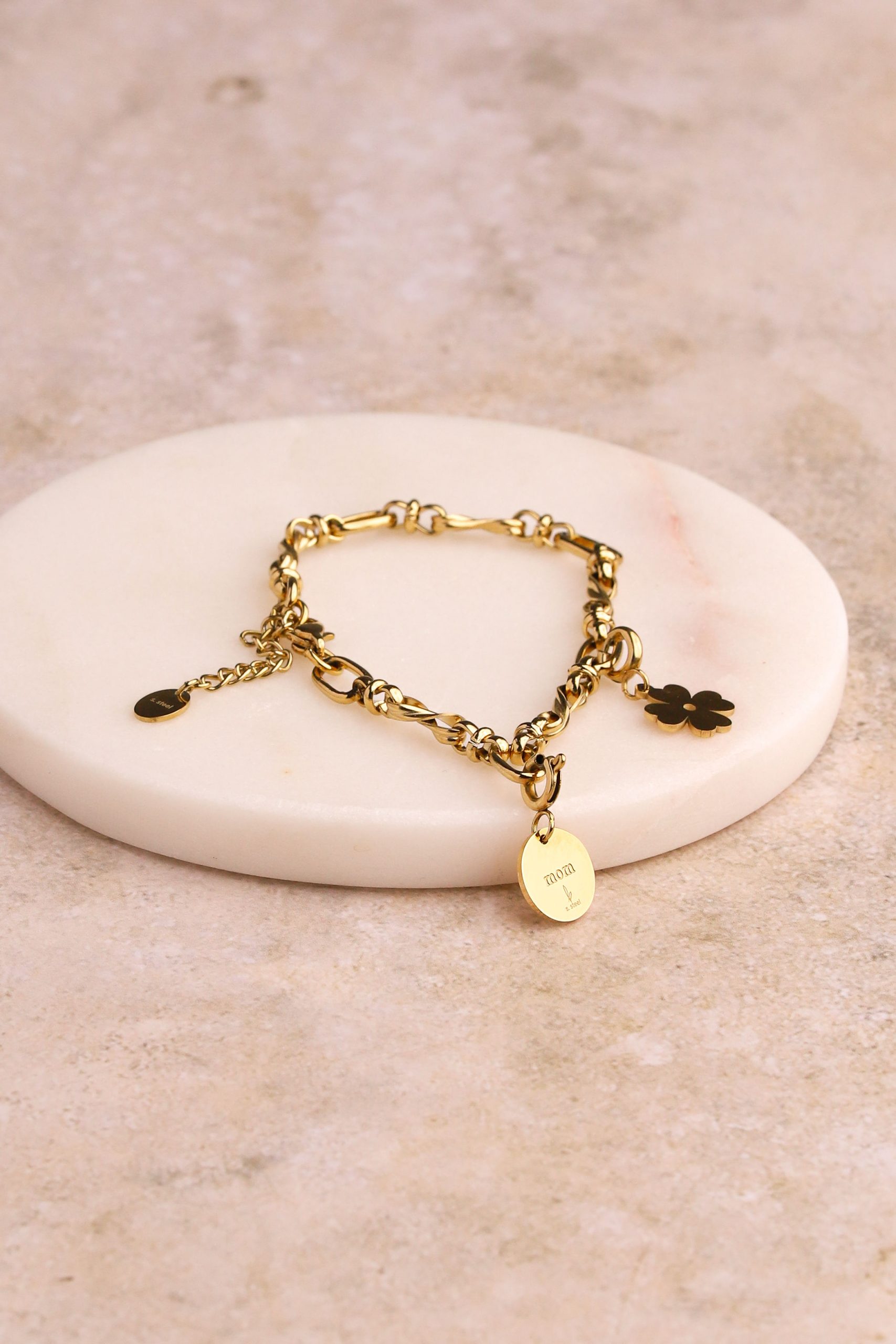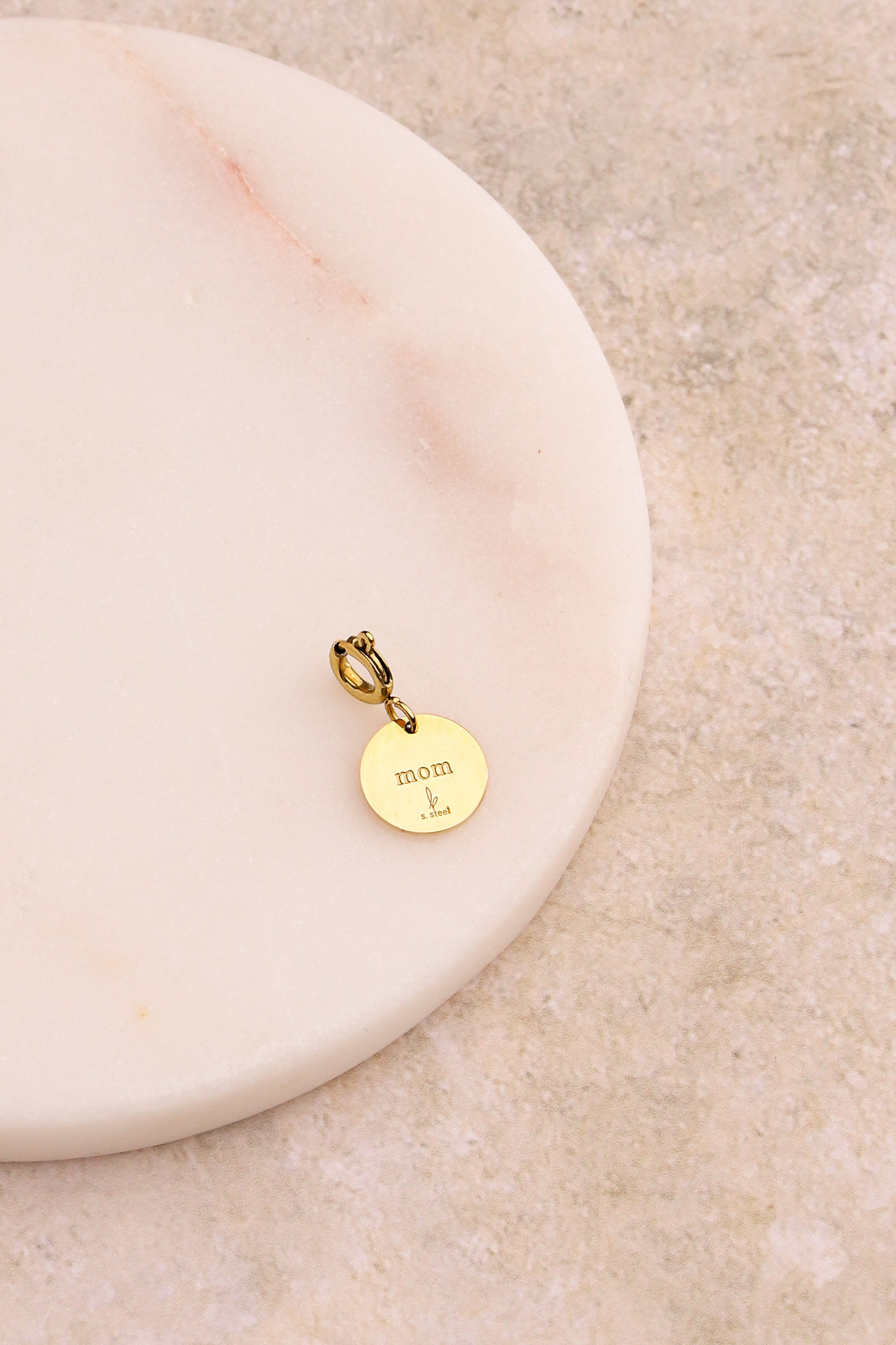 Charm en acier inoxydable composé de « Mom » sur une pastille ronde et un coeur gravé.