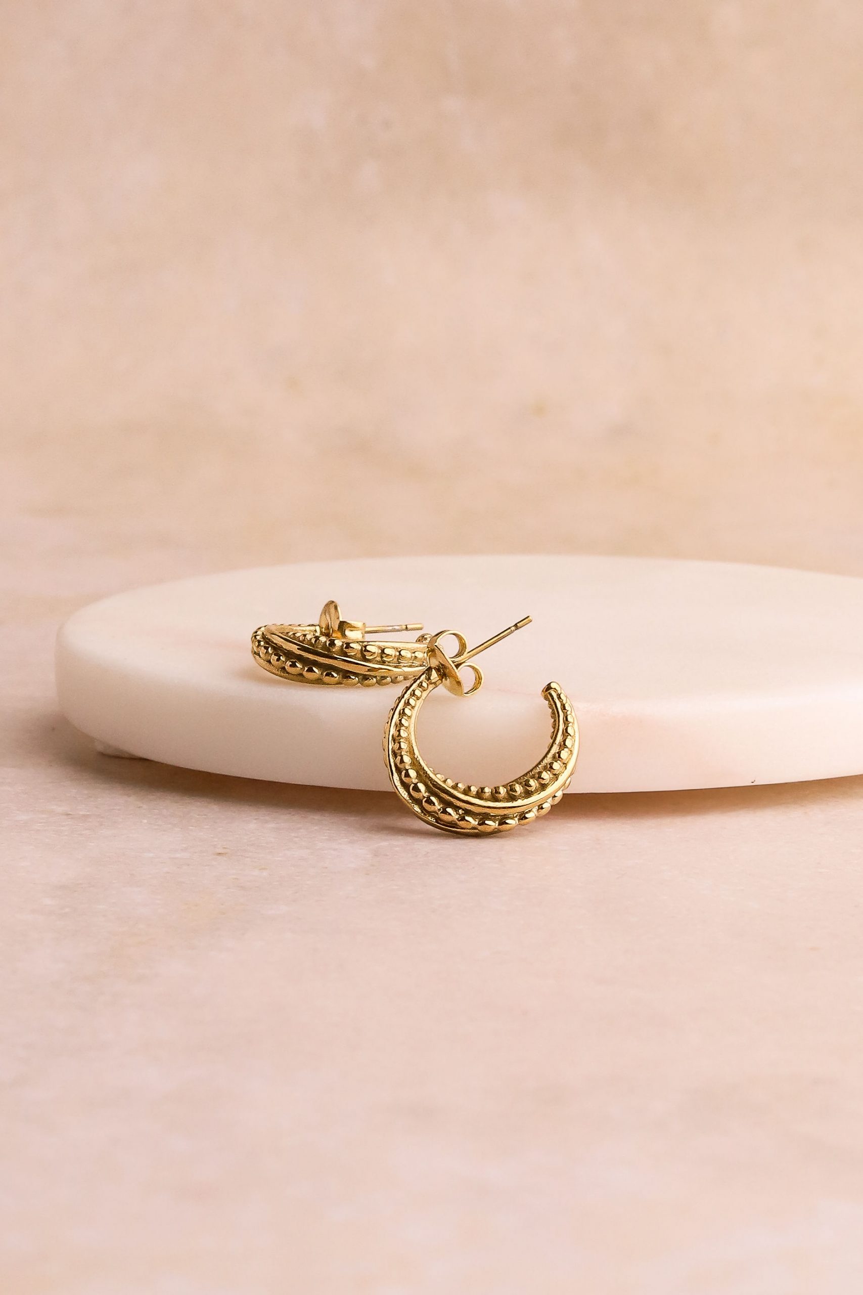Boucles d’oreilles type créoles en acier inoxydable composées d’un tourbillon de motifs ronds et lignes.